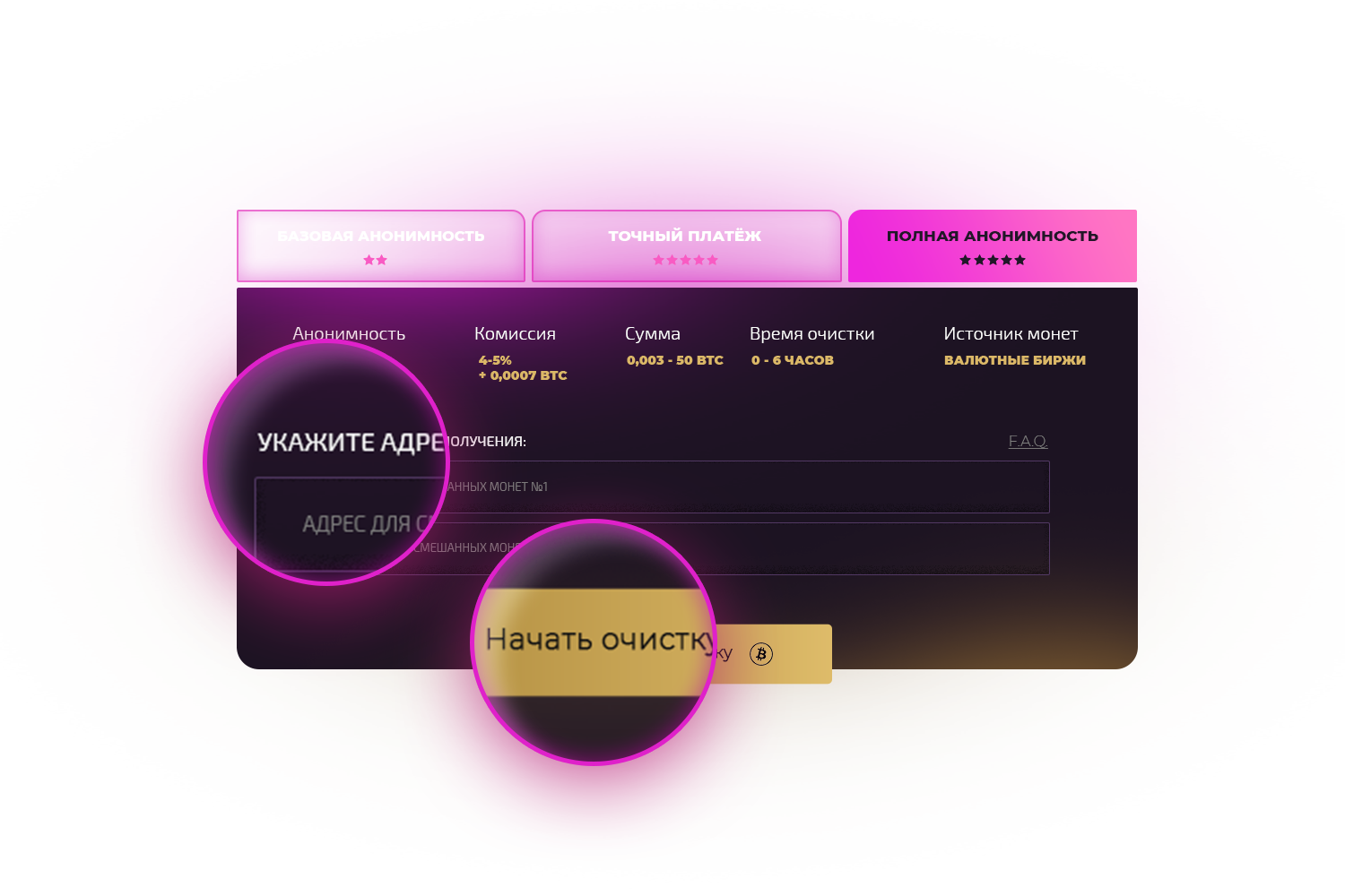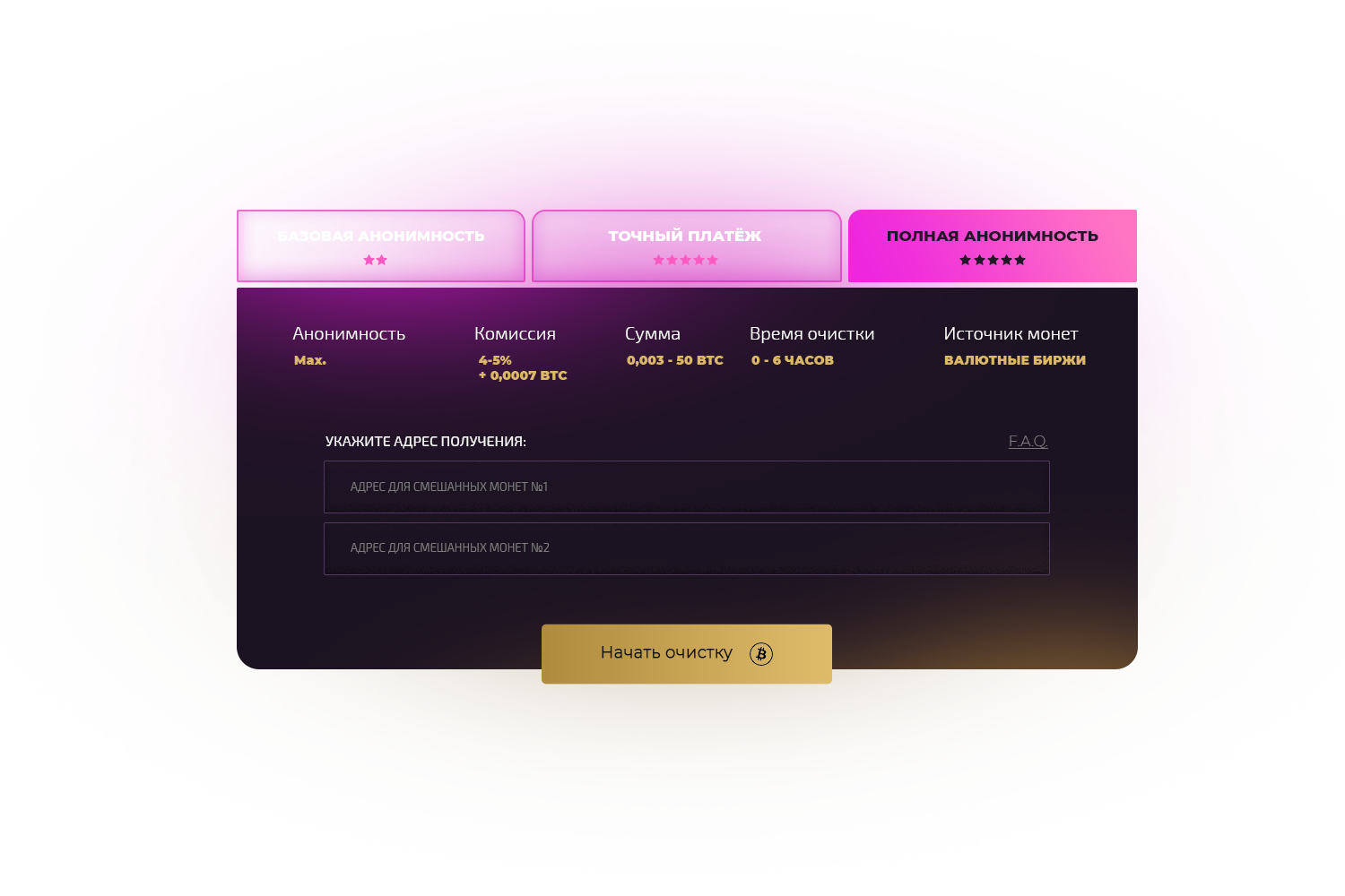 Минимальная сумма очистки — 0,001 BTC. (режим Миксер) Все перечисленные суммы меньше указанной будут рассматриваться как пожертвования. Максимальный объем за одну операцию: Миксер — 1 BTC. Полная анонимность — 50 BTC.